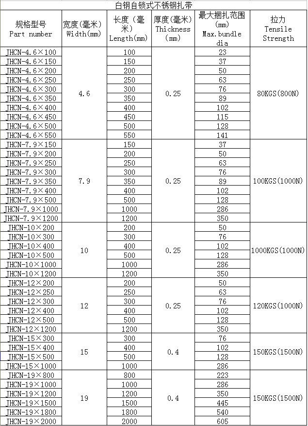 亮光不銹鋼扎帶系列: 產(chǎn)品材質(zhì):不銹鋼201、304、316 Material:SS201.304.316 使用溫度范圍:-80℃~430℃ 各產(chǎn)品寬度為:4.6MM 7.9MM 10MM 12MM 16MM 19MM 長度:100MM~2500MM均可定做 各寬度規(guī)格厚度參數(shù):4.6~7.9MM(0.25MM) 10~12MM(0.25~0.3MM)16~19MM(0.3~0.5MM) 產(chǎn)品特性:適應(yīng)環(huán)境能力強(qiáng)、耐磨損、承受力強(qiáng)